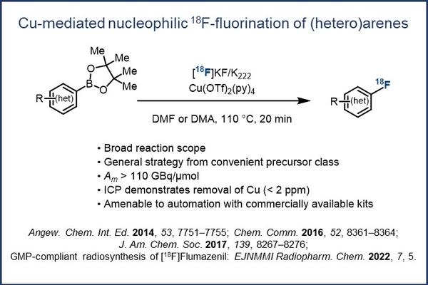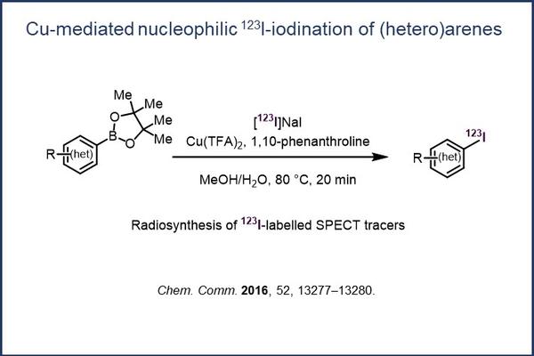 Our laboratories have developed a large portfolio of radiochemical transformations (18F and 123I) to meet the demands of imaging scientists. Our technologies enable access to structurally and functionally diverse radiolabelled compounds-from small molecule radiotracers to labelled biomolecules, such as peptides and proteins.